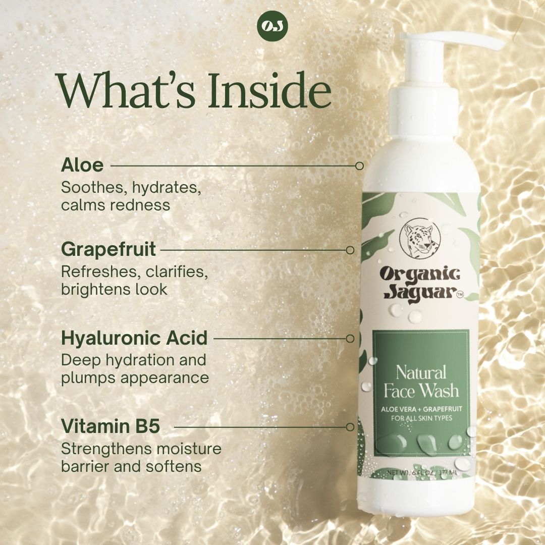 - GENTLE FACE CLEANSER FOR ALL SKIN TYPES: Organic Jaguar's Face Wash is designed for all skin types—dry, oily, combination, or sensitive. With soothing aloe vera, replenishing jojoba and coconut oils, and brightening pink grapefruit and lotus, it leaves skin feeling clean, calm, and naturally refresh.